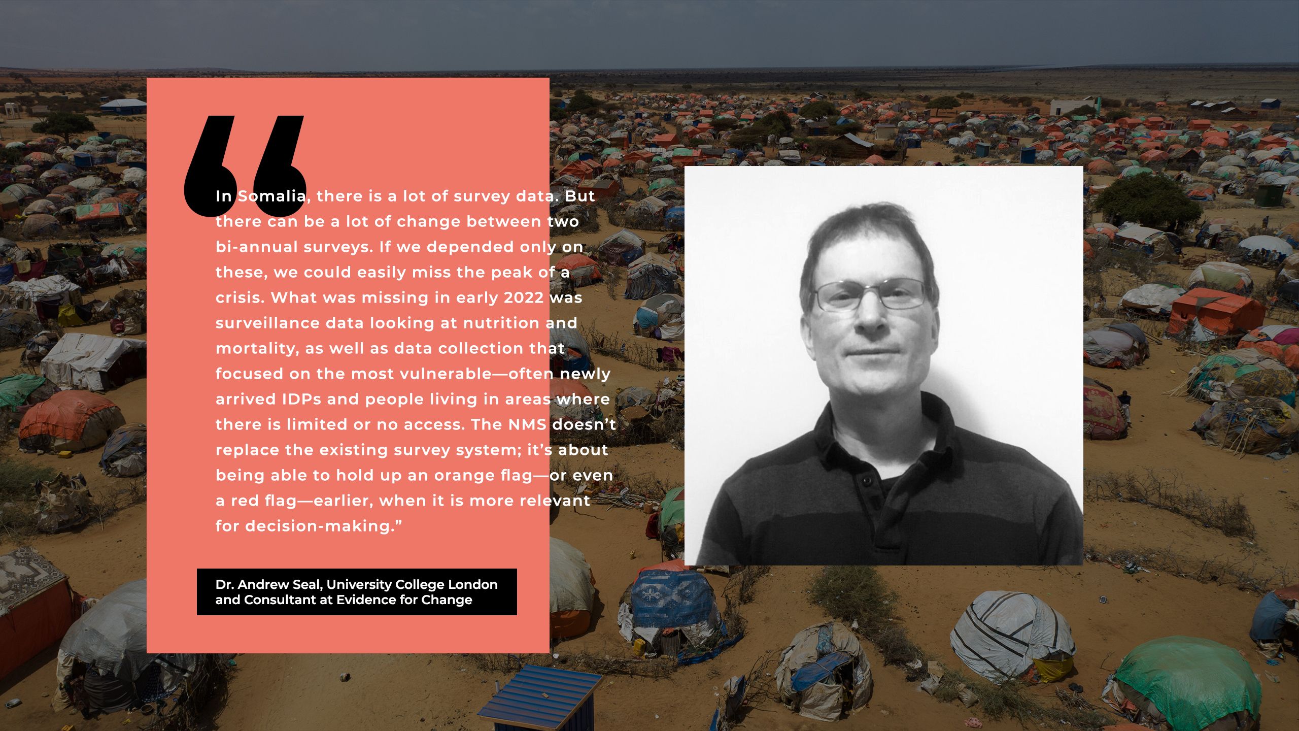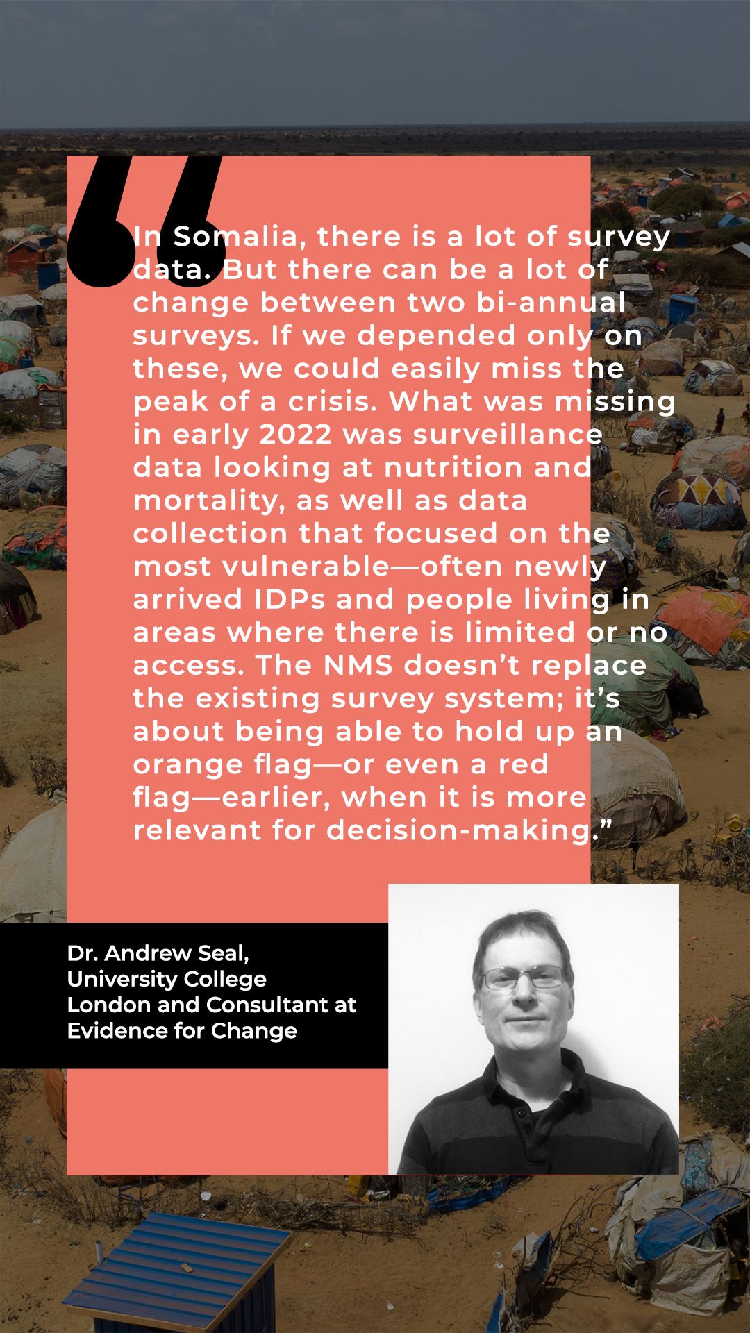 In an emerging drought context, timing is everything. That is one reason integrating the near-real-time nutrition and mortality monitoring proved to be an invaluable asset during the 2021-22 response. An important caveat, however, is the time it takes to start up both a monitoring system and humanitarian response once actors realize it is needed. While the Government of Somalia declared a state of emergency in November 2021, the NMS was only implemented in July 2022. As is evident from the graphics shown above, the peak of the crisis was likely missed.