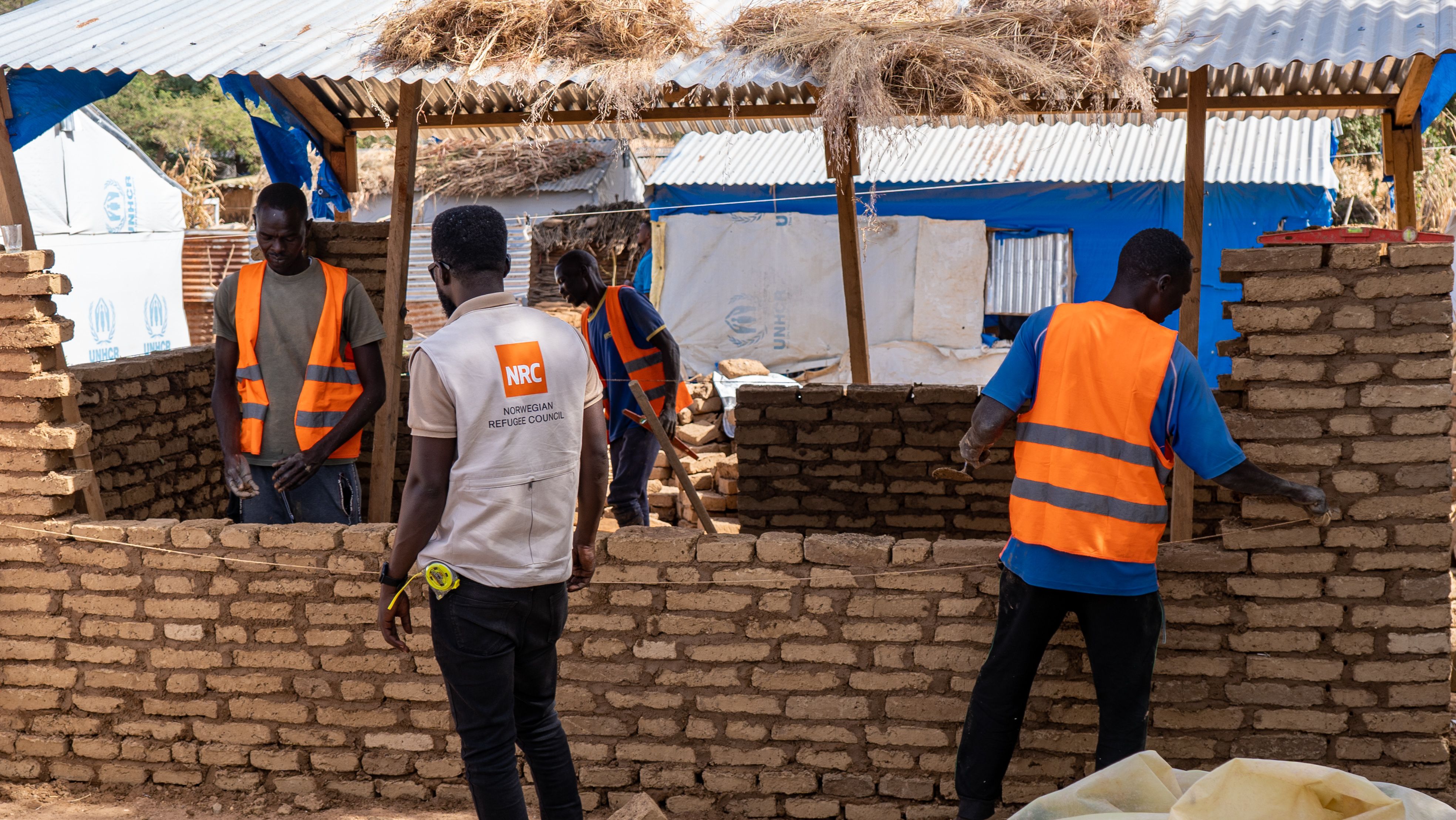 Bygge av tillfälligt skydd för sudanesiska flyktingar i Tchad i december 2024. Foto: Nasson Song PRIMOCO/NRC