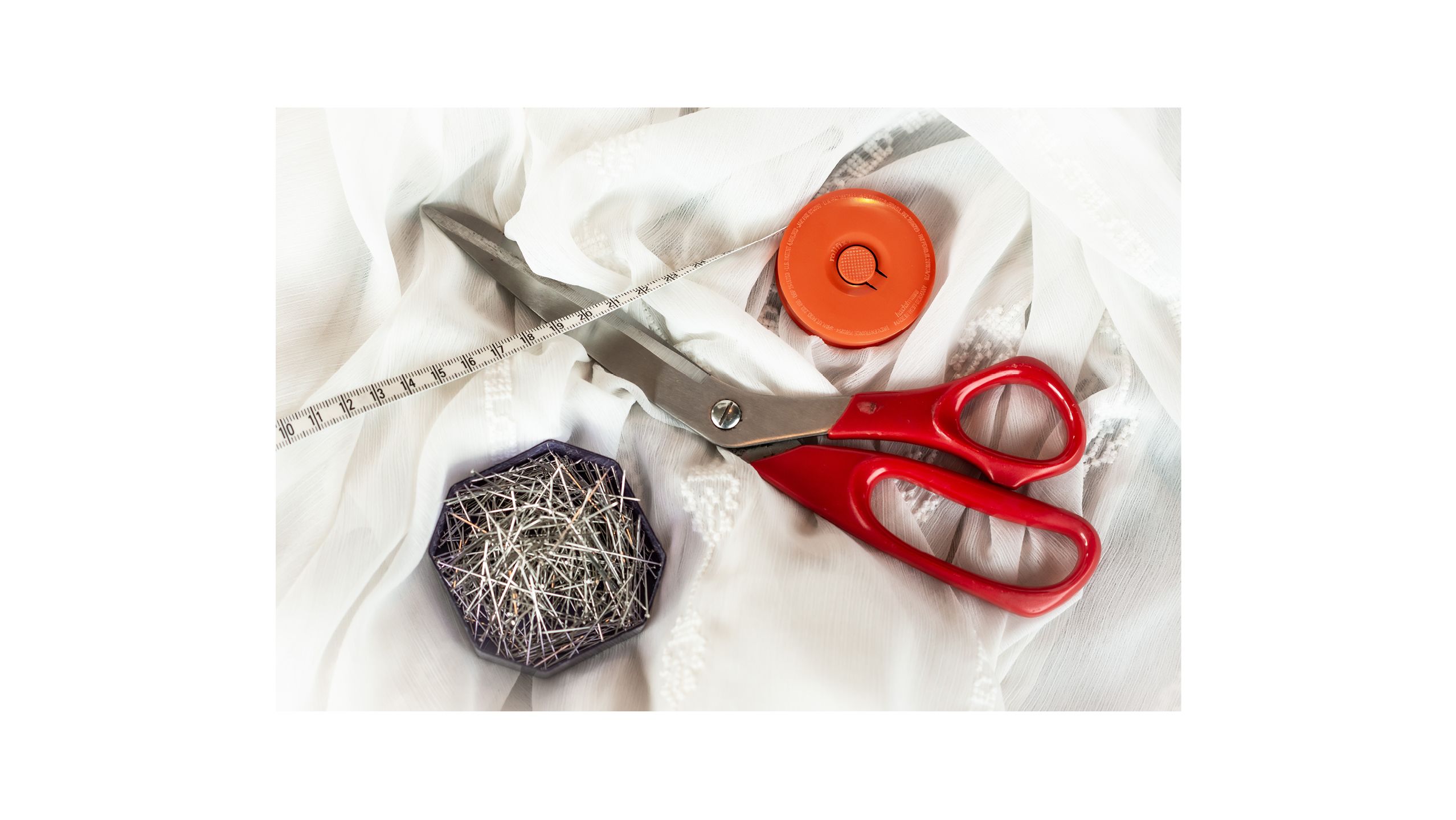 Two sewing machines. Fabrics in all colours. Sheets of sewing patterns, scissors, needles, thread and a tape measure. Decorative ribbons, buttons and zips.